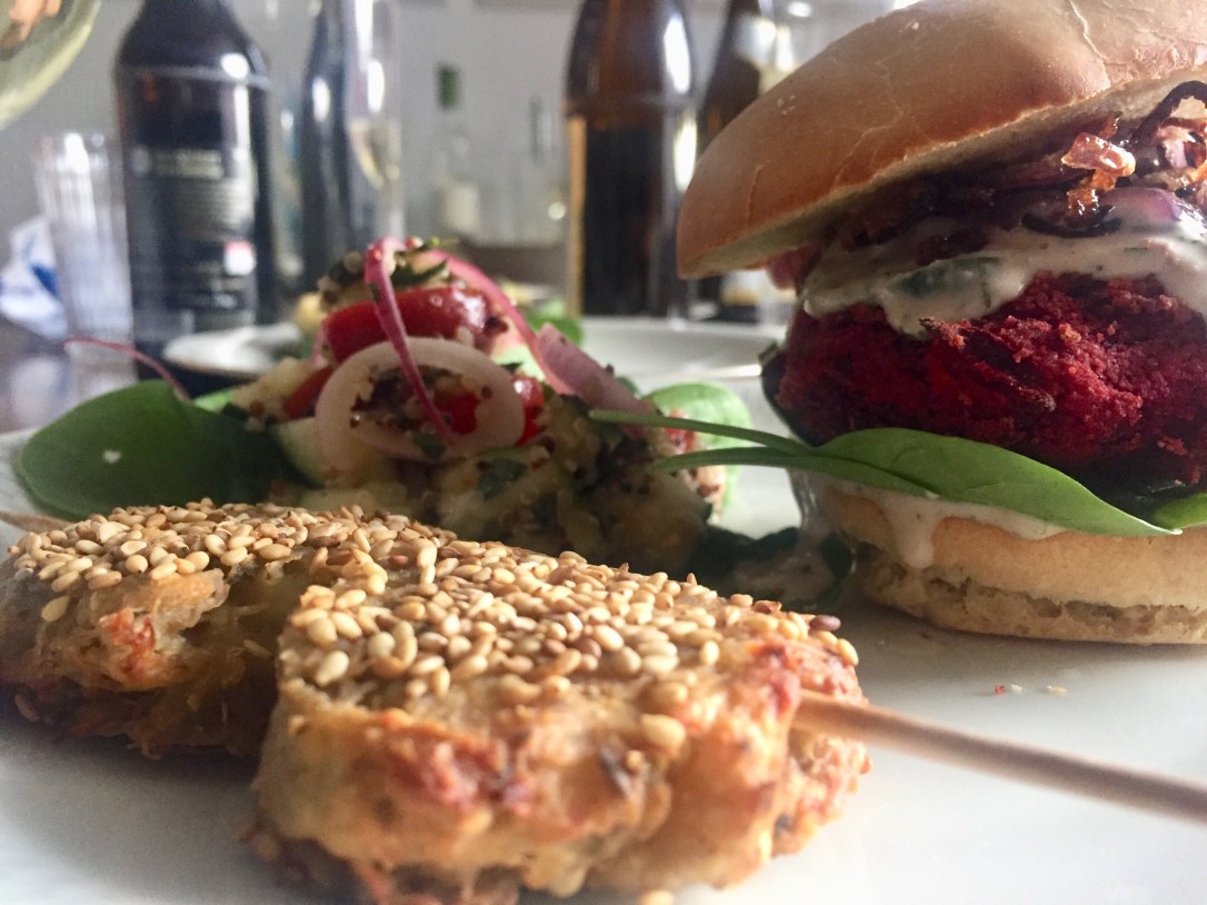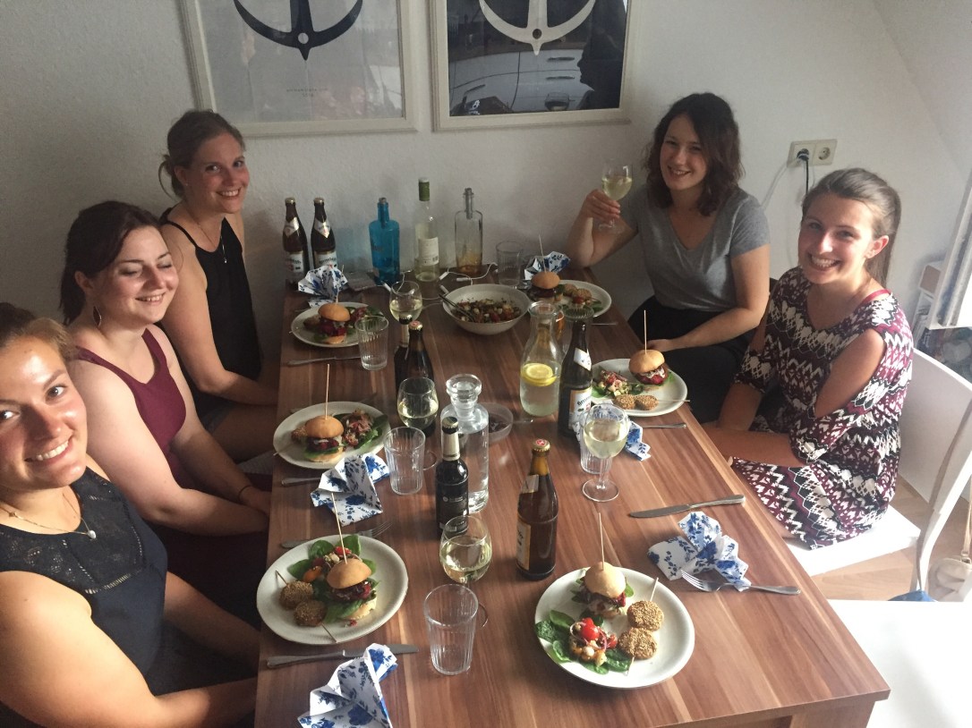So beschlossen also auch Rebekka und ich, an dieser coolen Aktion teilzunehmen. Einige Tage vorher erhielten wir die Information, dass wir einen Hauptgang zubereiten sollten und, wo wir wann sein sollten. Daraufhin begann die Planung und wir nutzten die ein oder andere langweilige Vorlesung, um diverse Kochbücher und -zeitschriften nach leckeren Rezepten zu durchforsten. Schließlich entschieden wir uns für Kokosburger mit Rote-Beete-Patty, Koriander-Sauce, Röstzwiebeln und Baby-Spinat, dazu ein Quinoa-Salat und Kartoffel-Knoblauch-Spieß. Klingt kompliziert – war es auch, und so musste eine weitere Vorlesung daran glauben, da wir uns am Donnerstag Vormittag zum Vorbereiten trafen. Einige Stunden, einen riesigen Berg schmutziges Geschirr und eine chaotische Küche später hatten wir dann alles soweit fertig, sodass wir direkt vor dem Servieren nur noch die Pattys und Röstzwiebeln braten, die Brötchen nochmal aufbacken und die Spieße in den Ofen schieben müssten.